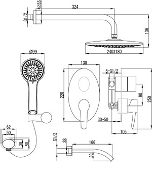 - Верхний овальный встраиваемый душ работает в одном режиме струи «Тропический душ», ручной душ – в пяти режимах.