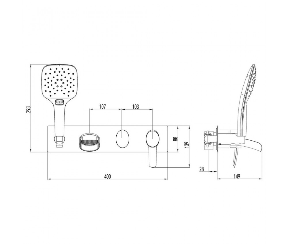 - На лицевой панели расположены держатель для душа, каскадный излив, поворотный керамический дивертор и металлическая рукоятка.
