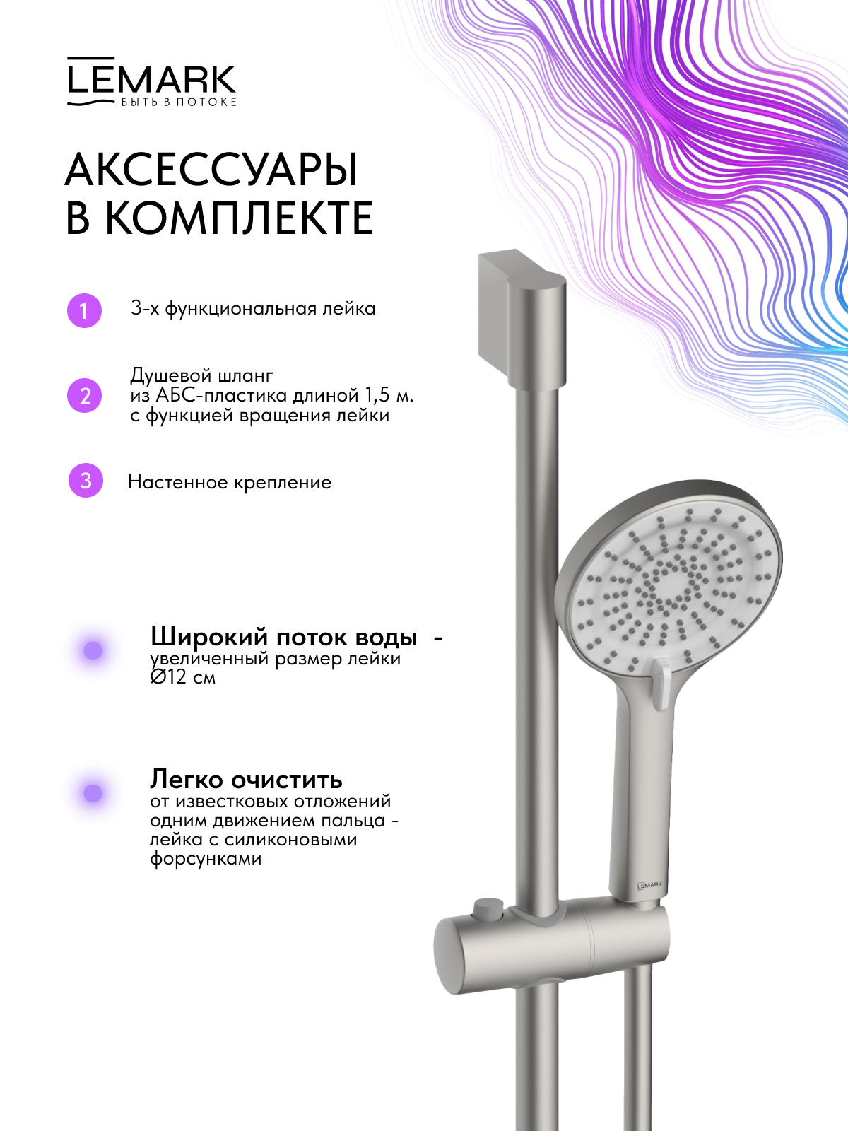 Аксессуары в комплекте (3-функциональная лейка 120?252 мм, регулируемое по высоте крепление для лейки, душевой шланг (ПВХ) 1,5 м)