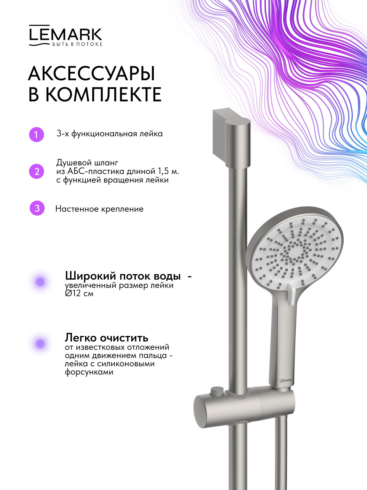 Аксессуары в комплекте (3-функциональная лейка 120?252 мм, регулируемое по высоте крепление для лейки, душевой шланг (ПВХ) 1,5 м)