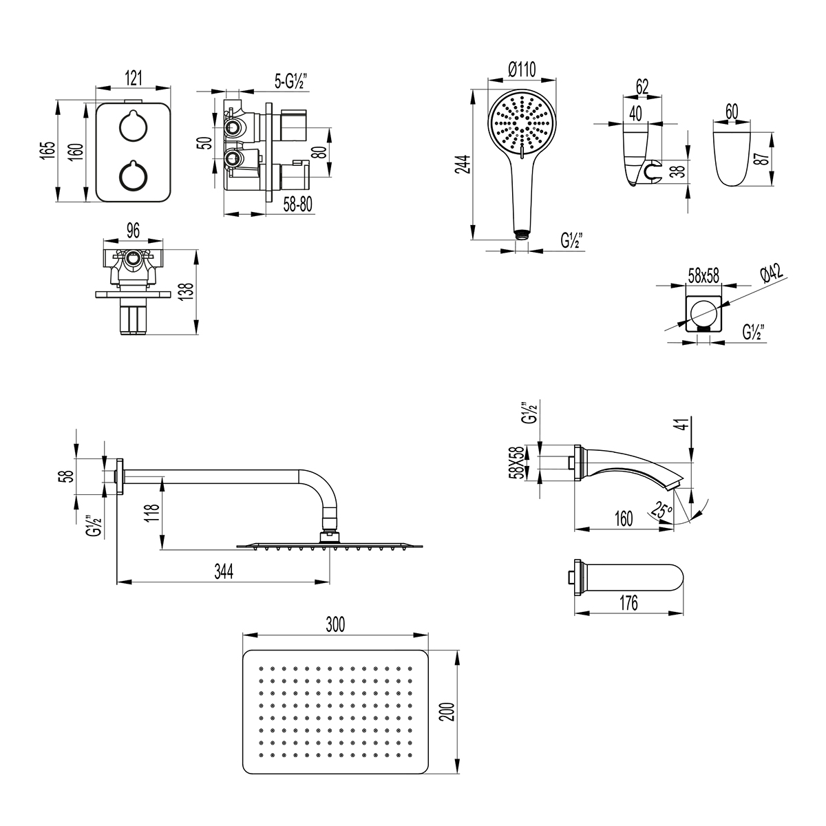 Встраиваемый термостатический смеситель с верхним душем 30х30 см, 3-х режимной лейкой для душа и изливом 19 см, латунь/хром