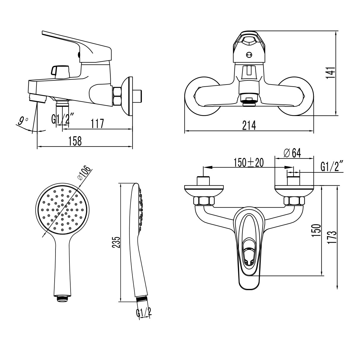- Аксессуары в комплекте: шланг 1,5 м, настенное поворотное крепление, 1-функциональная лейка 106x235 мм