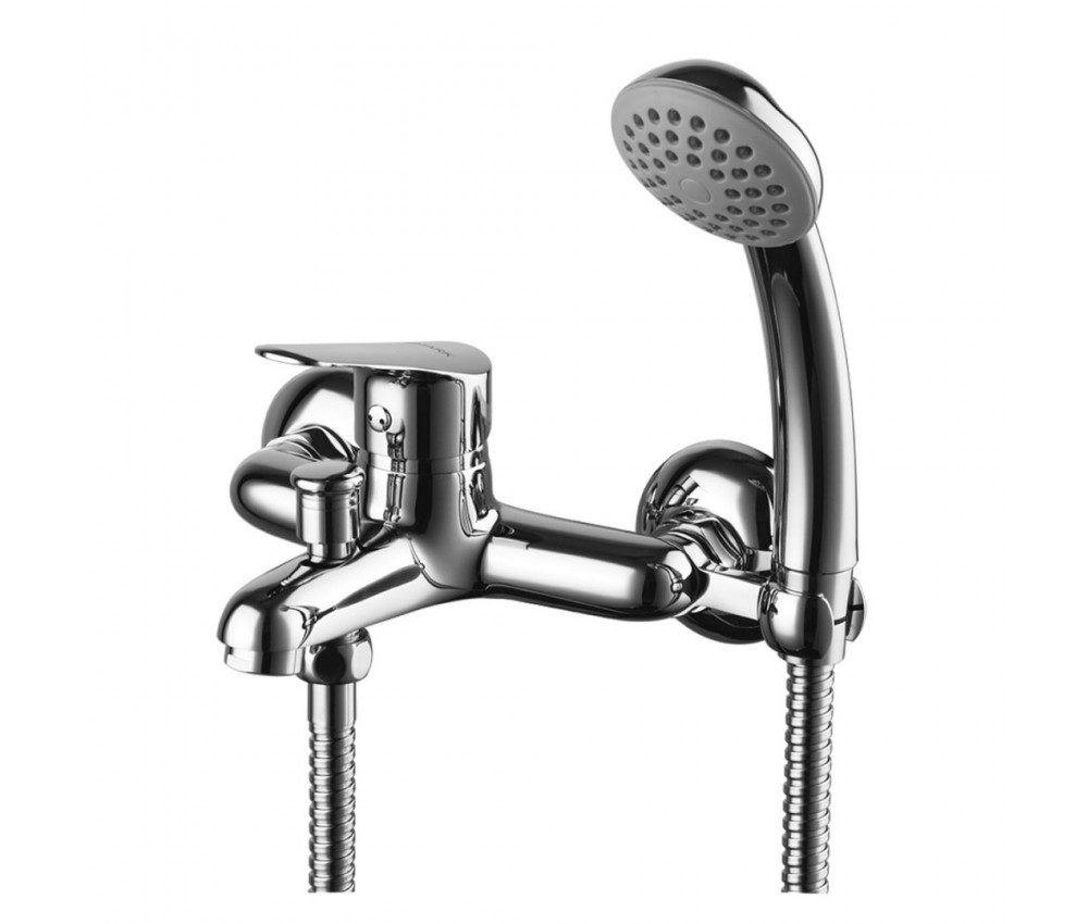 - Конструкция с монолитным изливом и металлической рукояткой дополнена душевым гарнитуром: лейкой, шлангом и удобным кронштейном.