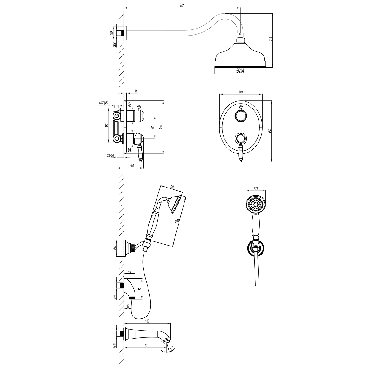- Аксессуары в комплекте (верхняя душевая лейка «Тропический дождь» 204 мм, держатель верхней лейки, 1-функциональная лейка 78х215 мм, настенное поворотное крепление для лейки, подключение душевого шланга, душевой шланг 2 м)