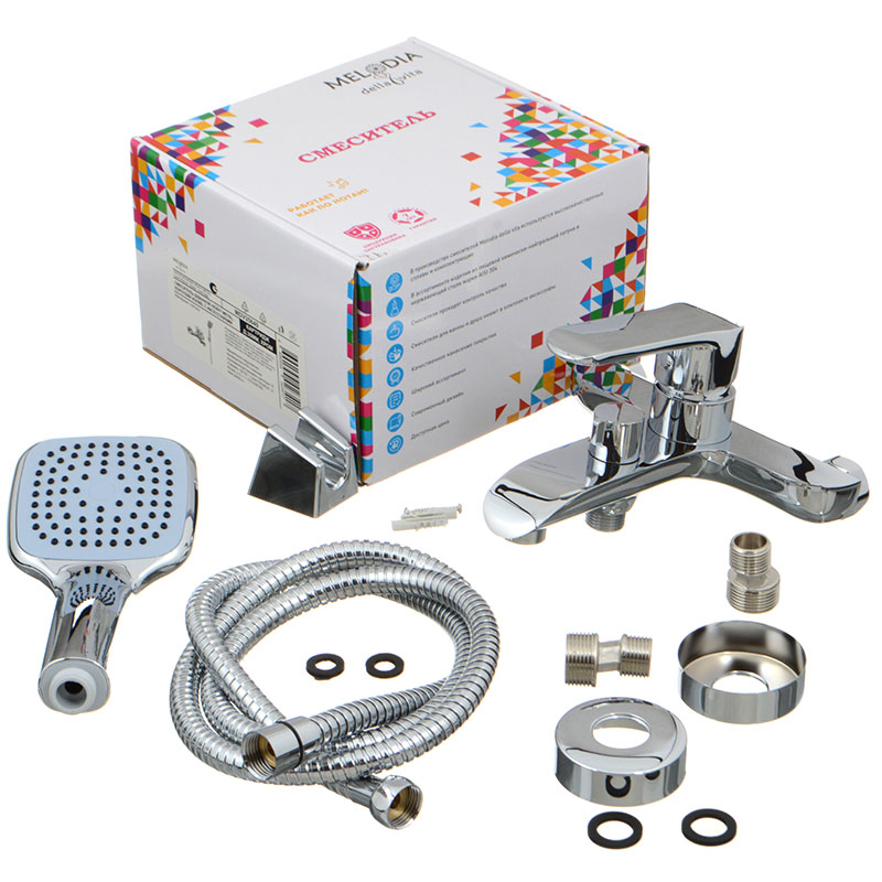 Состав поставки: держатель лейки, душевая лейка, душевой шланг, комплект отражателей, комплект эксцентриков, смеситель
