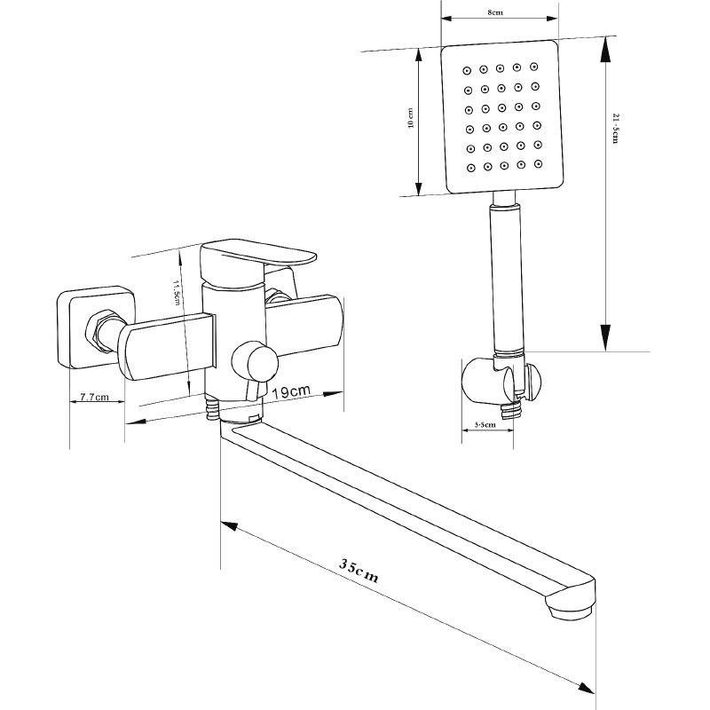 Состав поставки: держатель лейки, душевая лейка, душевой шланг, комплект отражателей, комплект эксцентриков, смеситель