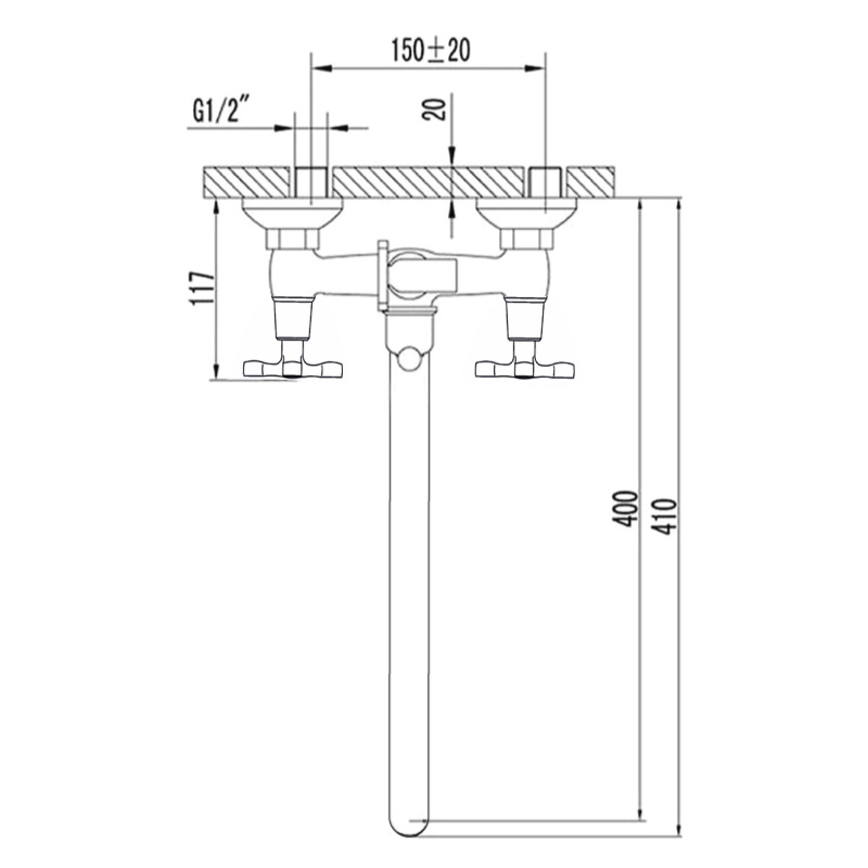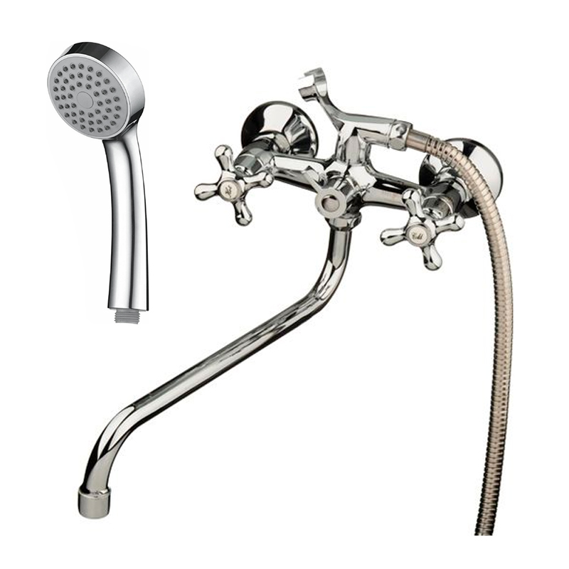 Смеситель для ванны латунный с керамическими кран-буксами 1/2", длинный люксовый поворотный излив, маховики-крестики, шланг 1,5м из нержавеющей стали, лейка ?75мм 1-функциональная, крепеж хром
