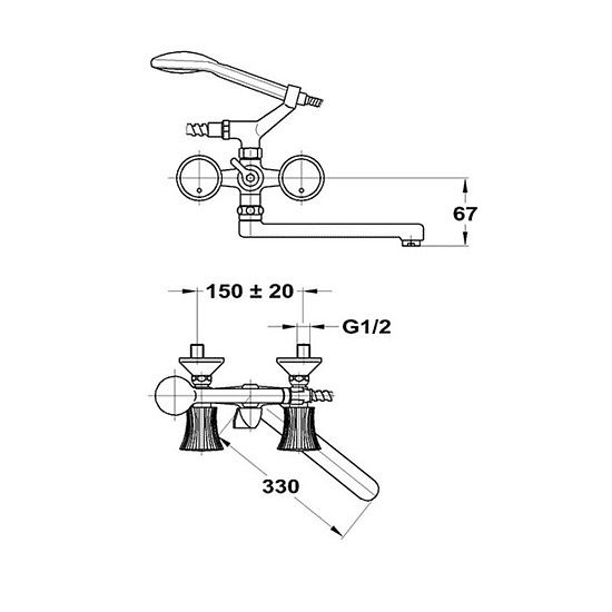 Смеситель с плоским изливом 330 мм. выполнен из высококачественной латуни. В комплекте поставляется шланг из нерж. стали, противонакипная лейка. Модель с долговечными классическими кран-буксами (керамика) (Германия), поставляется с пластмассовыми ручками Primula.