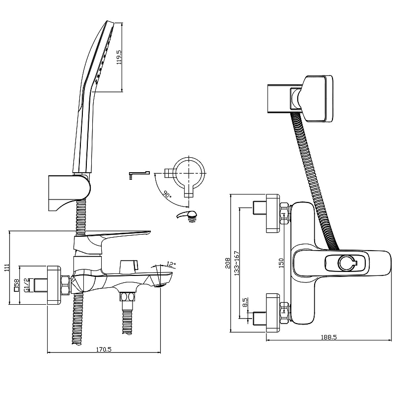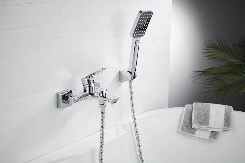 Смеситель для ванны с коротким изливом, поворотный переключатель, 3-х режимная лейка, латунь/хром
