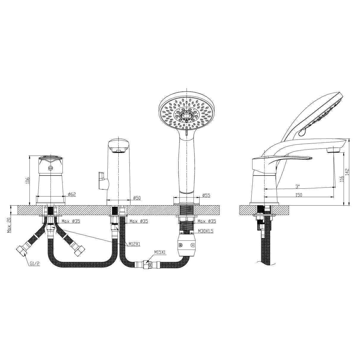 Смеситель для ванны и душа Rossinka T40-39 с душевым комплектом (T40-39)