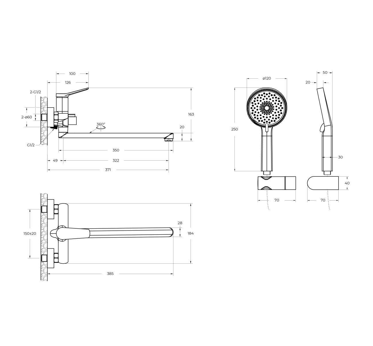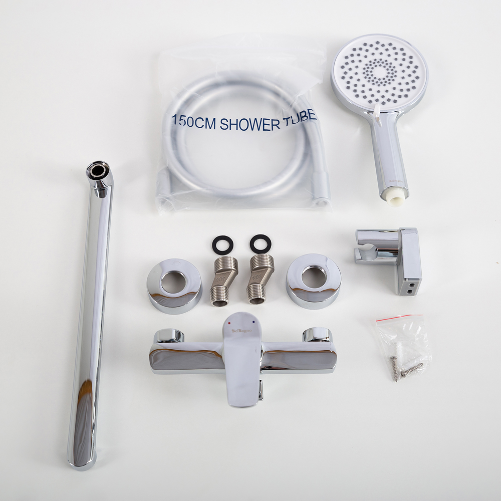 Комплектация: Душевой шланг 150 см ПВХ, душевая лейка 3-х режимная из ABS, настенный держатель ручного душа, смеситель