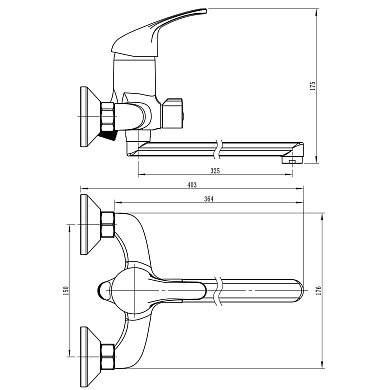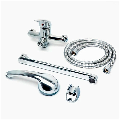В комплекте металлический излив длиной 30 см с аэратором, шланг 1,5 метра, душевая лейка и латунные эксцентрики.