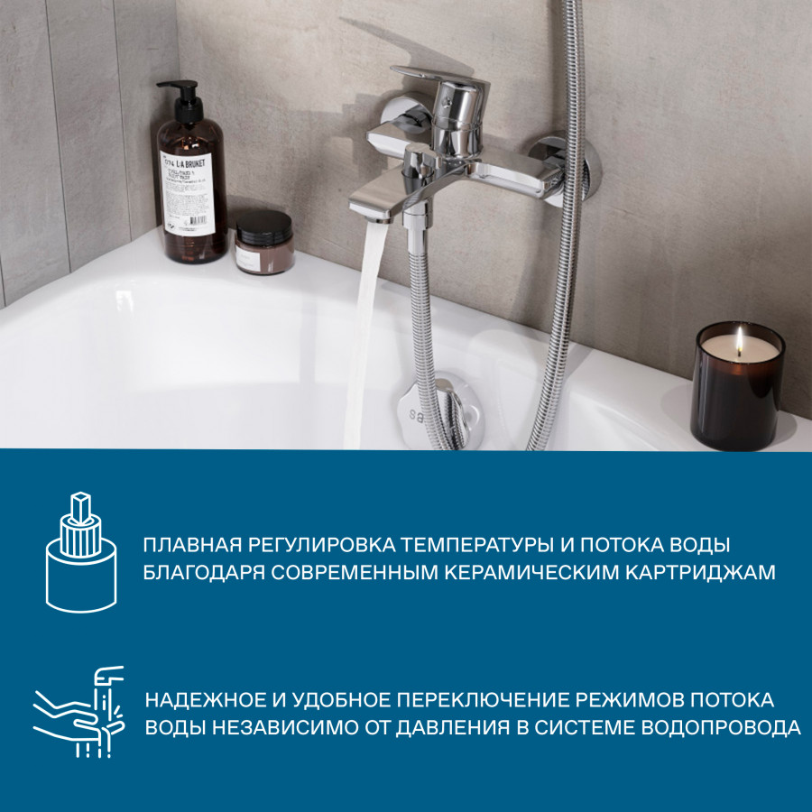 Santek Арма Смеситель однорычажный для ванны-душа, хром, - настенный монтаж, - душевой набор в комплекте: лейка D100 мм, шланг 1.5 м, настенный держатель, - поворортный керамический переключатель ванна/душ: надежное и удобное переключение режимов потока воды независимо от давления в системе водопровода, - подключение душевого шланга 1/2, - S образные эксцентрики в комплекте, - керамический картридж D35 мм, плавный ход рычага смесителя, контроль и точность при выборе напора и температуры воды, - долгий срок службы, герметичность и безопасность для здоровья за счет использования высококачественных материалов и надежных компонентов, - хромированная поверхность, зеркальный блеск и защита от коррозии на долгий срок.
