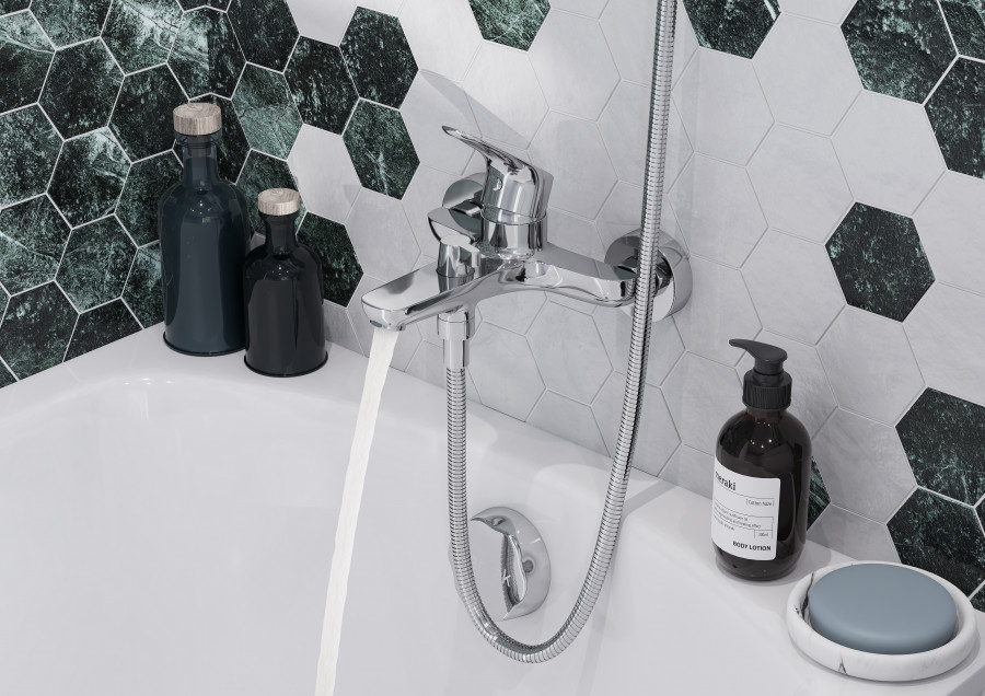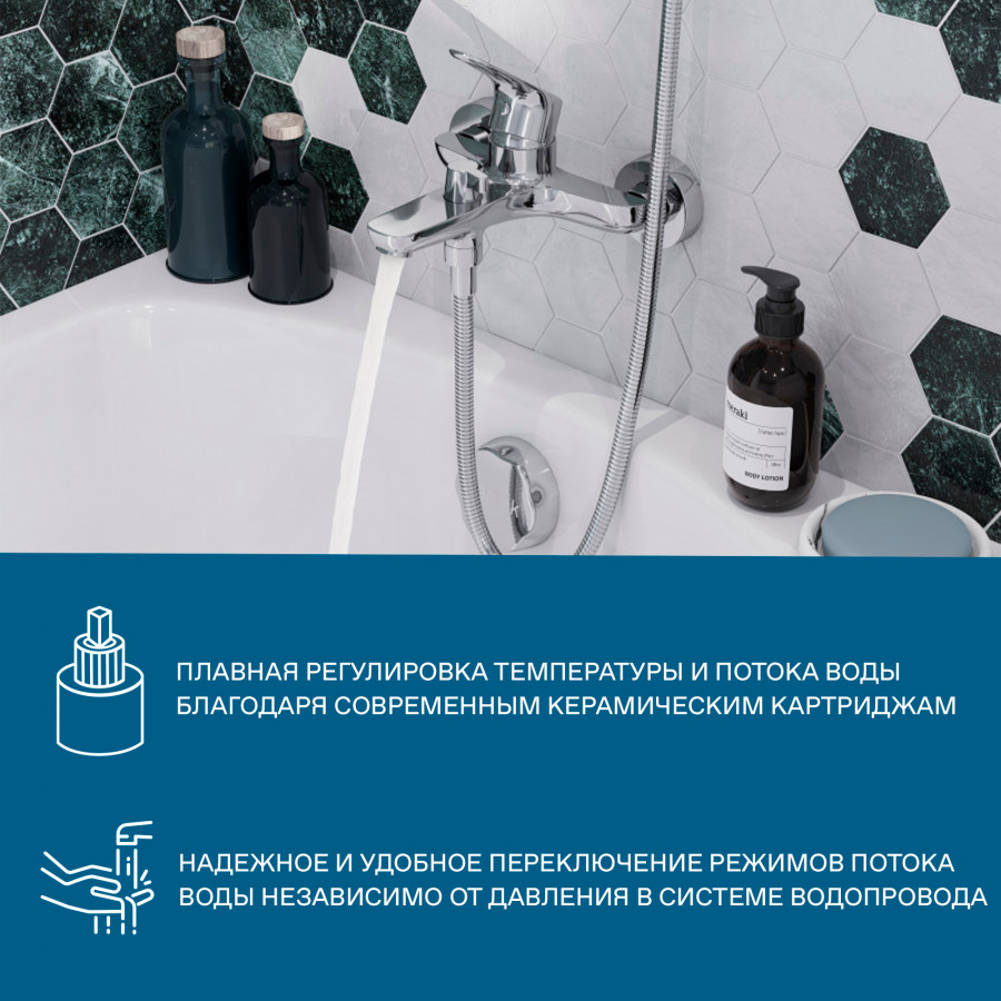 Santek Форт Смеситель однорычажный для ванны-душа, хром, - настенный монтаж, - душевой набор в комплекте: лейка D100 мм, шланг 1.5 м, настенный держатель, - поворотный керамический переключатель ванна/душ: надежное и удобное переключение режимов потока воды независимо от давления в системе водопровода, - подключение душевого шланга 1/2, - S образные эксцентрики в комплекте, - керамический картридж D35 мм, плавный ход рычага смесителя, контроль и точность при выборе напора и температуры воды, - долгий срок службы, герметичность и безопасность для здоровья за счет использования высококачественных материалов и надежных компонентов, - хромированная поверхность, зеркальный блеск и защита от коррозии на долгий срок.