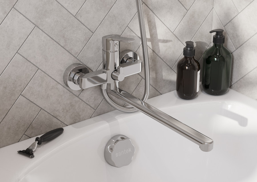 Santek Найра Смеситель однорычажный для ванны-душа с длинный поворотным изливом, хром, - настенный монтаж, - душевой набор в комплекте: лейка D100 мм, шланг 1.5 м, настенный держатель, - поворотный керамический переключатель ванна/душ: надежное и удобное переключение режимов потока воды независимо от давления в системе водопровода, - подключение душевого шланга 1/2, - поворотный излив из нержавеющей стали 320 мм, - S образные эксцентрики в комплекте, - керамический картридж D35 мм с плавным ходом рычага смесителя, контроль и точность при выборе напора и температуры воды, - долгий срок службы, герметичность и безопасность для здоровья за счет использования высококачественных материалов и надежных компонентов, - хромированная поверхность, зеркальный блеск и защита от коррозии на долгий срок.