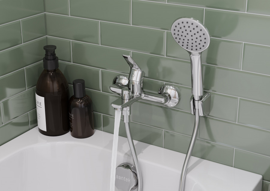 Santek Венга Смеситель однорычажный для ванны-душа, хром, - настенный монтаж, - душевой набор в комплекте: лейка D100 мм, шланг 1.5 м, настенный держатель, - поворотный керамический переключатель ванна/душ: надежное и удобное переключение режимов потока воды независимо от давления в системе водопровода, - подключение душевого шланга 1/2, - S образные эксцентрики в комплекте, - керамический картридж D35 мм, плавный ход рычага смесителя, контроль и точность при выборе напора и температуры воды, - долгий срок службы, герметичность и безопасность для здоровья за счет использования высококачественных материалов и надежных компонентов, - хромированная поверхность, зеркальный блеск и защита от коррозии на долгий срок.
