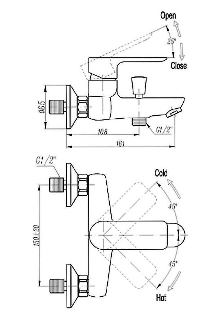 Длина излива – 161 мм, универсальный аэратор М24 под углом 45 градусов