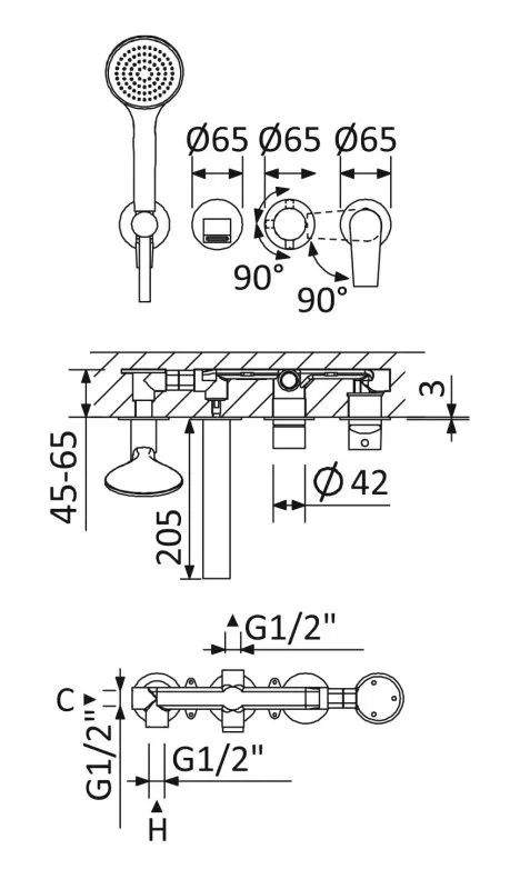 Смеситель для ванны и душа встраиваемый Cezares Nautic на 3 выхода, с ручным душем, черный матовый (NAUTIC-VDM3-NOP)