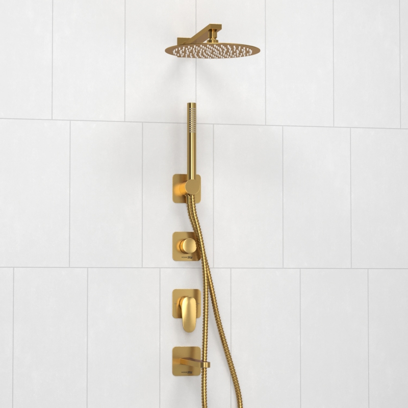 Смеситель для ванны и душа встраиваемый с верхней душевой насадкой, лейкой WasserKRAFT матовое золото (A3651.283.284.180.259.285.194.286)