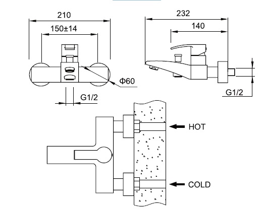 Излив 232мм, расстояние между центрами 150 мм