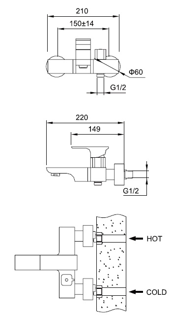 Излив 220 мм, расстояние между центрами 150 мм