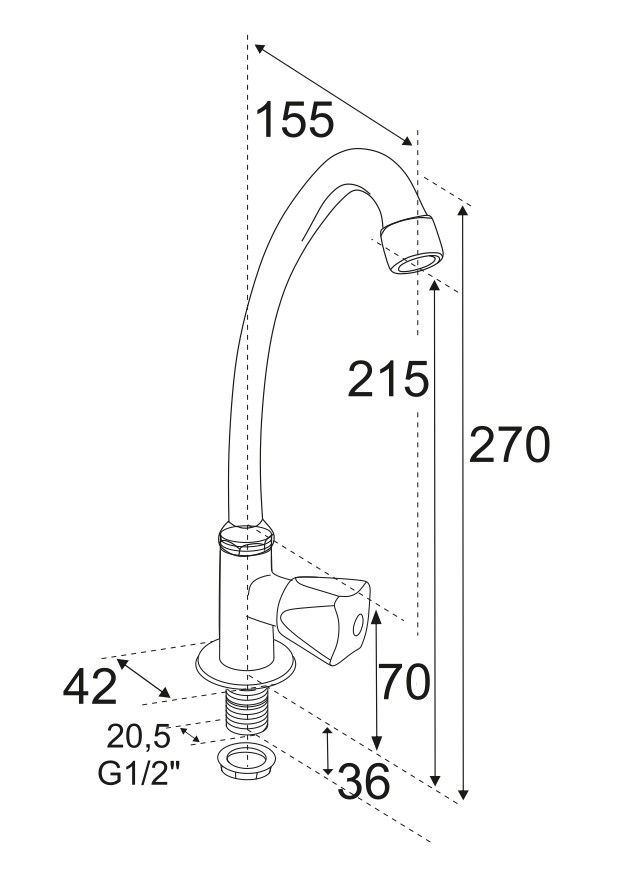 Кран смеситель ЦС-КР 11/2 серии ""Стандарт"" от подольской производственно-торговой группы ""Центр Сантехники"" предназначен для выдачи холодной или горячей воды с помощью поворотного излива высотой 215 мм, монтаж на столешницу или мойку, регулировка напора с помощью пластикового хромированного маховика Крест с керамической кран-буксой. Подключение воды 1/2"".