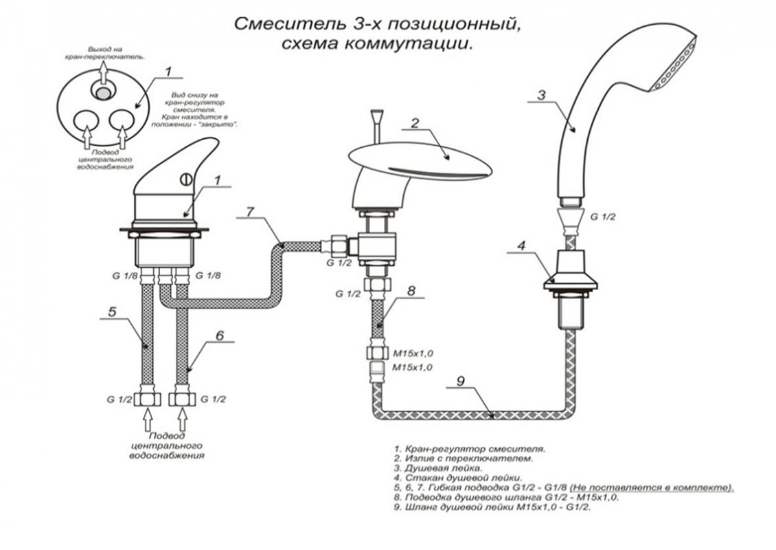 - излив на ванну с девиатором (переключение излив-лейка)