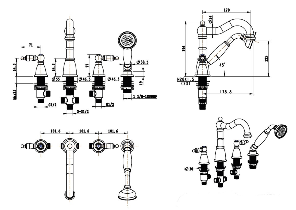 Состав поставки: смеситель, излив, душевой шланг, ручной душ, переключатель потоков, гибкая подводка, крепежный комплект