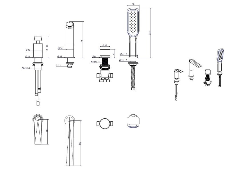 Состав поставки: смеситель, душевая лейка, душевой шланг, гибкая подводка, набор креплений