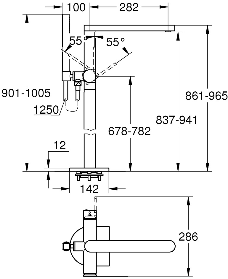 смеситель напольный, щелочная моно батарейка 6 V, 4 кнопочные батарейки, внешняя батарея, GROHE SilkMove керамический картридж 28 мм, GROHE AquaGuide регулируемый аэратор, нажимной донный клапан 1 1/4, гибкая подводка