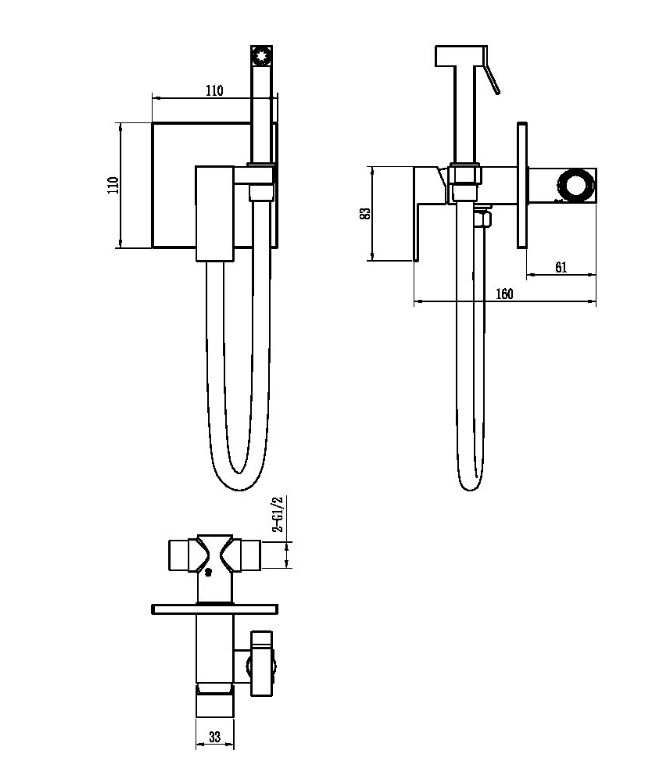 Состав поставки: смеситель (внешняя и внутренняя часть), шланг, настенный держатель, гигиеническая лейка