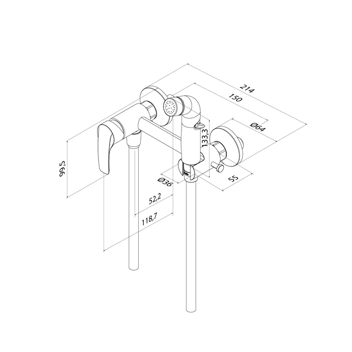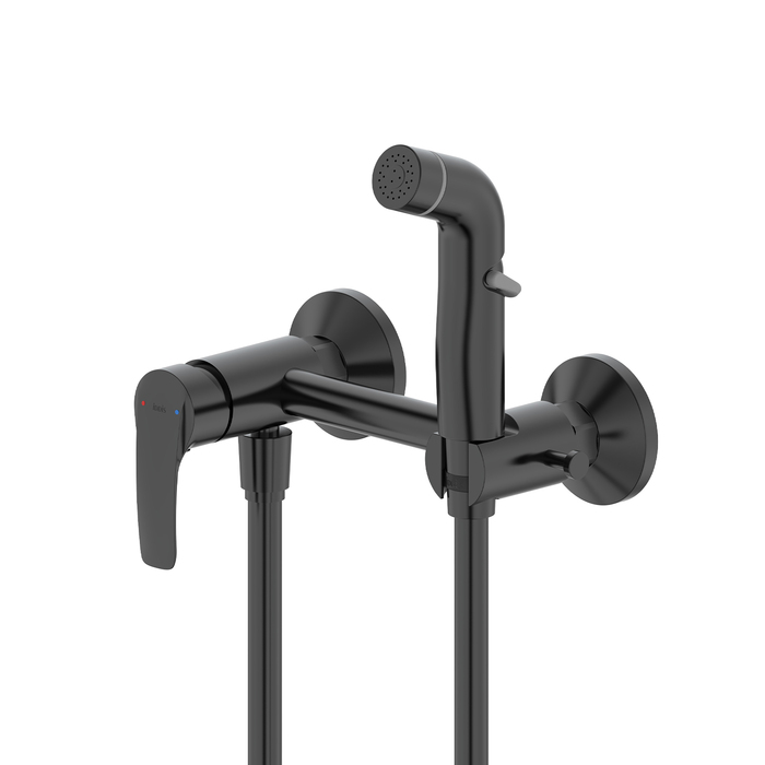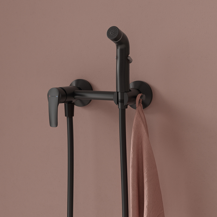 Смеситель с гигиеническим душем, Латунь ЛЦ40C (ГОСТ 17711-93), Матовый черный, Электрофоретическое покрытие, Однозахватный, Монтаж - На стену, Подключение - Эксцентрики с отражателями.