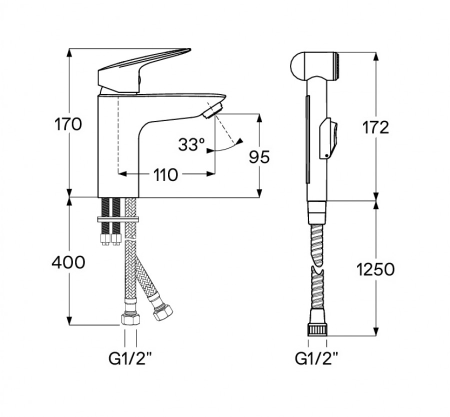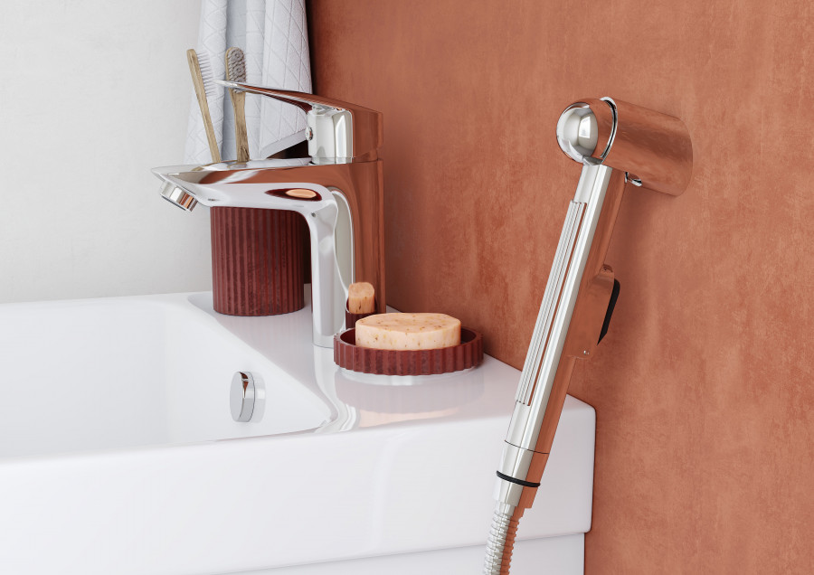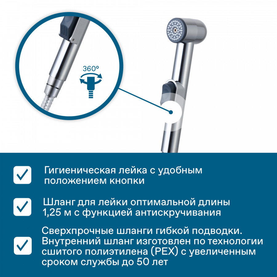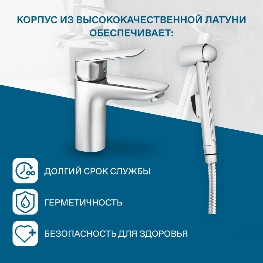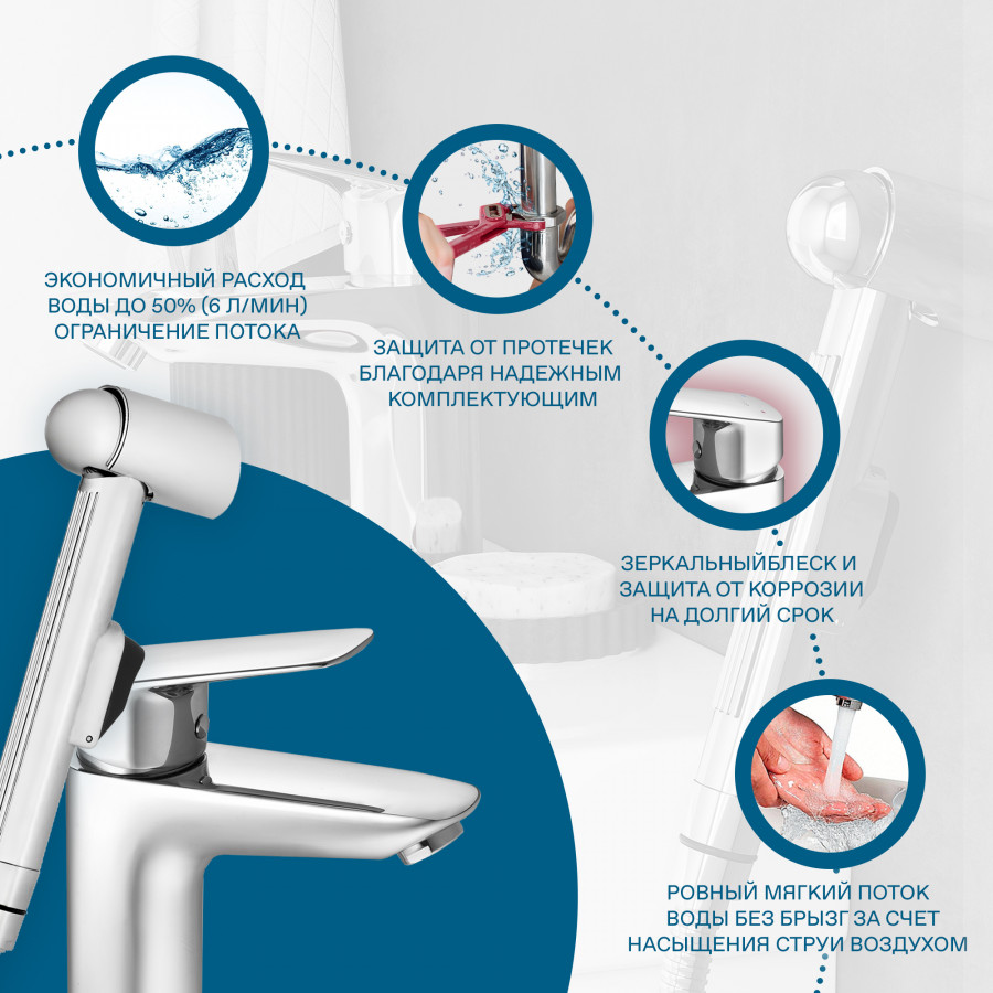 Santek Таос Смеситель однорычажный для раковины, с гигиеническим душем, хром, - установка на одно отверстие, - гигиенический душ с настенным держателем и шлангов в комплекте, - усиленный шланг 1.25 м с фукнцией антискручивания, - экономичный расход воды 6 литров/мин (при давлении 3 бар), - ровный и мягкий поток без брызг за счет насыщения струи воды воздухом, - Гибкая подводка G1/2" x M10, - сверхпрочные шланги гибкой подводки, изготовленные по технологии сшитого полиэтилена (PEX) с увеличенным сроком службы до 50 лет, в оплетке из нержавеющей стали AISI 304, - керамический картридж D40 мм, плавный ход рычага смесителя, контроль и точность при выборе напора и температуры воды, - долгий срок службы, герметичность и безопасность для здоровья за счет использования высококачественных материалов и надежных компонентов, - хромированная поверхность, зеркальный блеск и защита от коррозии на долгий срок.