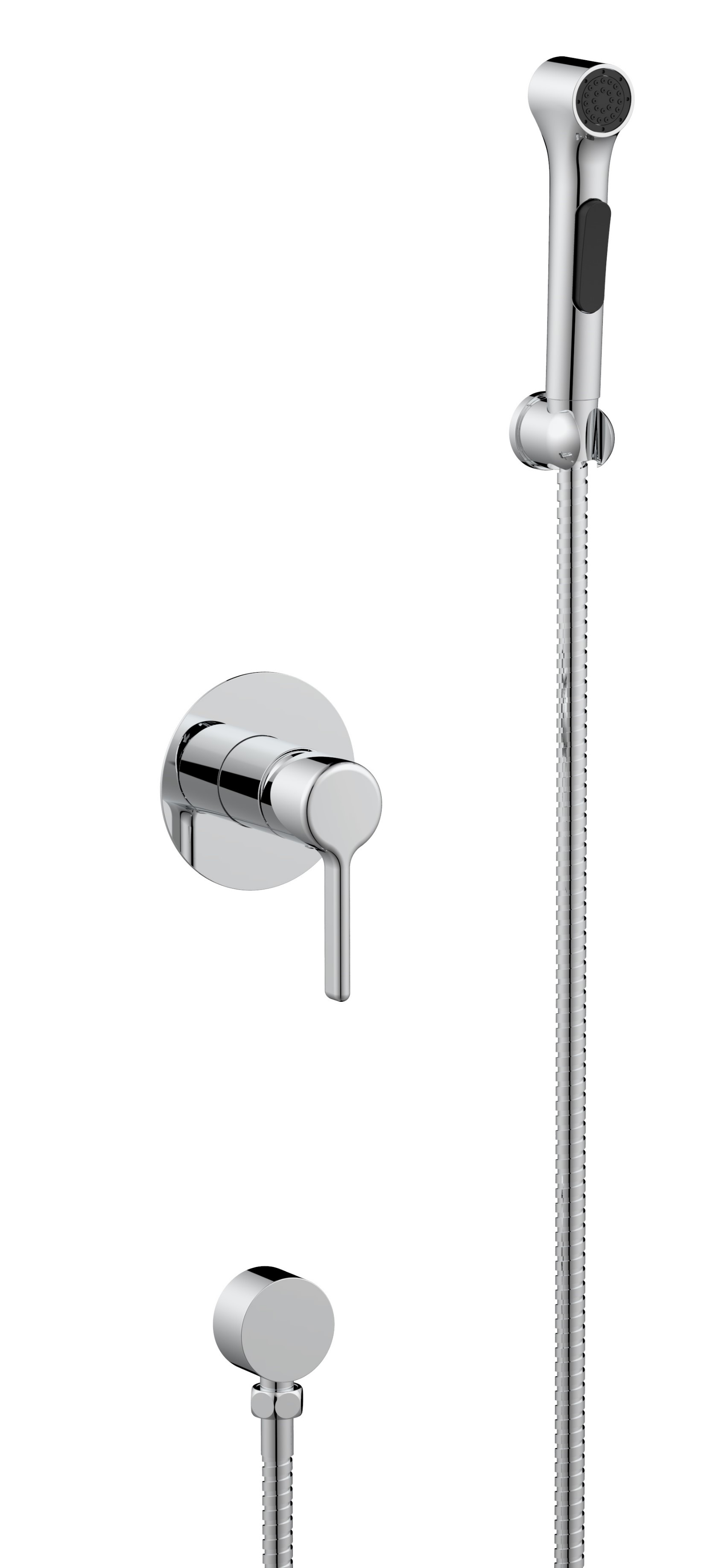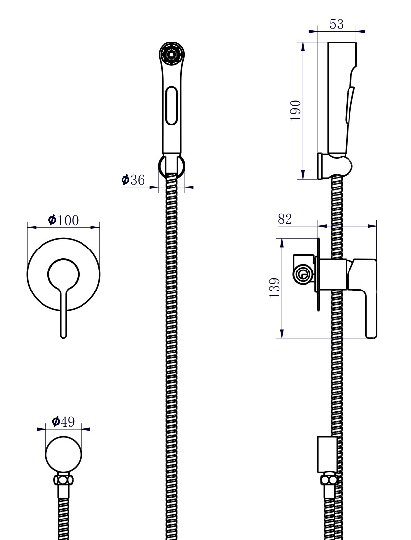 В комплекте: Смеситель, ручка, шланг, лейка, настенный держатель, декоративная накладка, декоративное подключение для шланга, монтажный комплект, шестигранник.