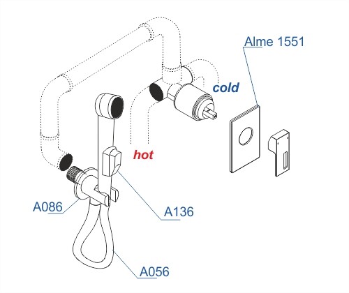 Состав поставки: Смеситель для душа Alme 1551, подключение шланга A086, шланг для душа 1000 мм А056, гигиеническая лейка с фиксатором А136