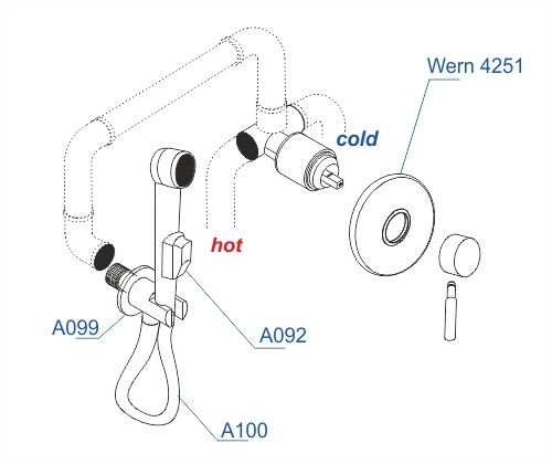 Состав поставки: смеситель для душа Wern 4251, подключение шланга A099, шланг для душа 1500 мм А100, гигиеническая лейка с фиксатором A092