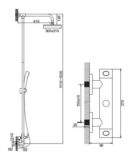 Смеситель с верхним душем, двухрычажный, латунь, увеличенное никель-хромовое покрытие.В комплекте: верхняя душевая насадка 300x210 мм, лейка для душа 1 режим, стойка для душа 1400 мм латунь,плечо 410 мм,поворотный дивертор, держатель для лейки, шланг для душа 1,5 м, нержавеющая сталь, крепеж.