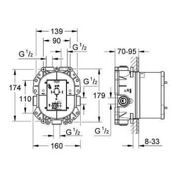 Встроенный универсальный термостат Grohe Rapido T 35500000 для ванной, душа и и центрального термостата. Без комплекта верхней монтажной части. Неглубокая заделка 70-95 мм. Элементарная встройка, полностью смонтирован и проверен на заводе. Встроенный термоэлемент GROHE TurboStat. Большой расход воды 50 л/мин при использовании всех выводов. 2 вывода сверху по 1/2, отвод снизу 1/2 - только для использования с запорным вентилем. Надежный монтаж благодаря прочному корпусу и защитной накладке. Подготовленные точки крепления для сухого и мокрого монтажа. Материал для уплотнения к стене в комплекте. Аквадиммер или запорный вентиль в сборе. Корпус из латуни с низким содержанием цинка. Встроенные обратные клапаны и грязеулавливающие фильтры.