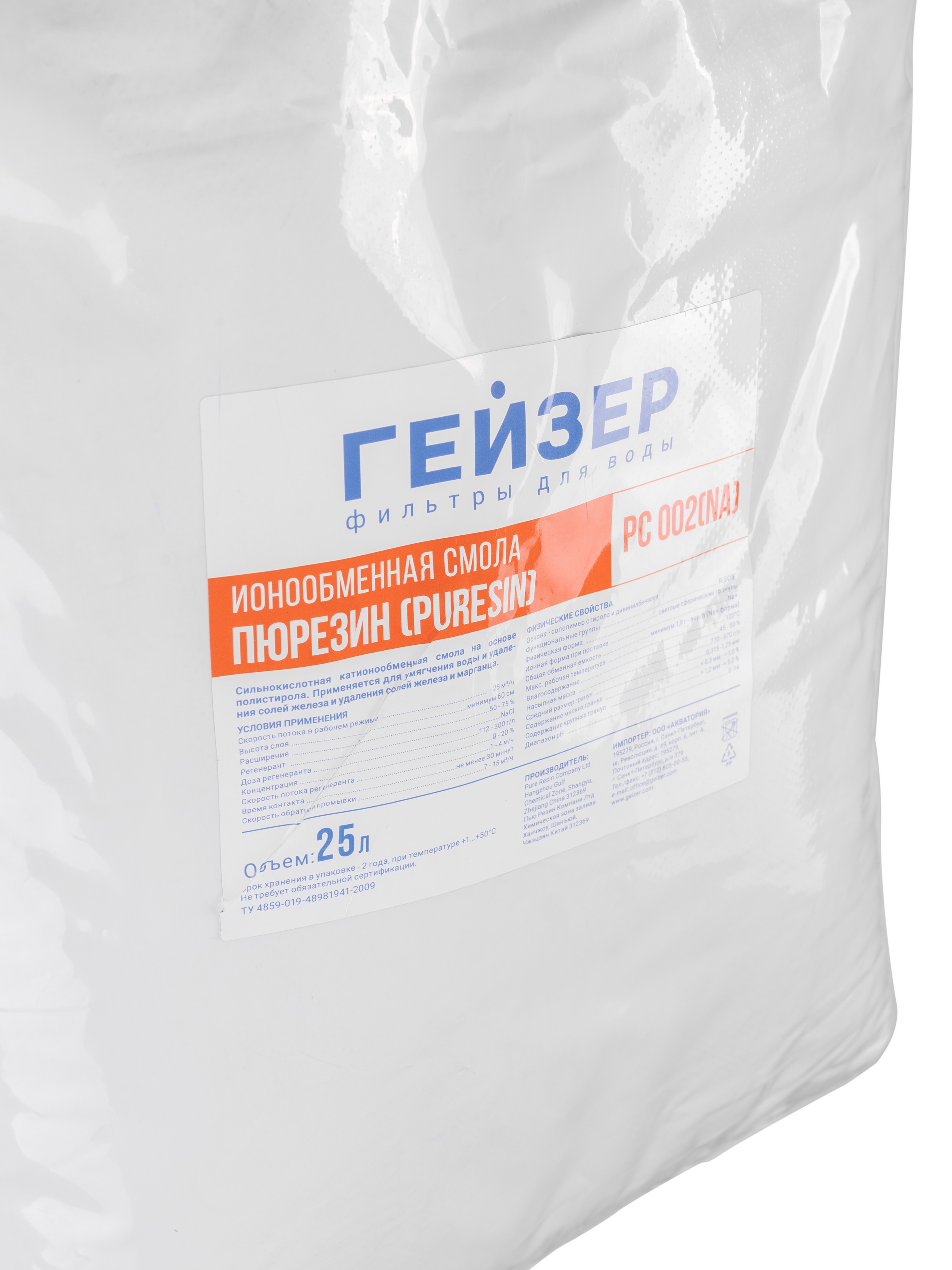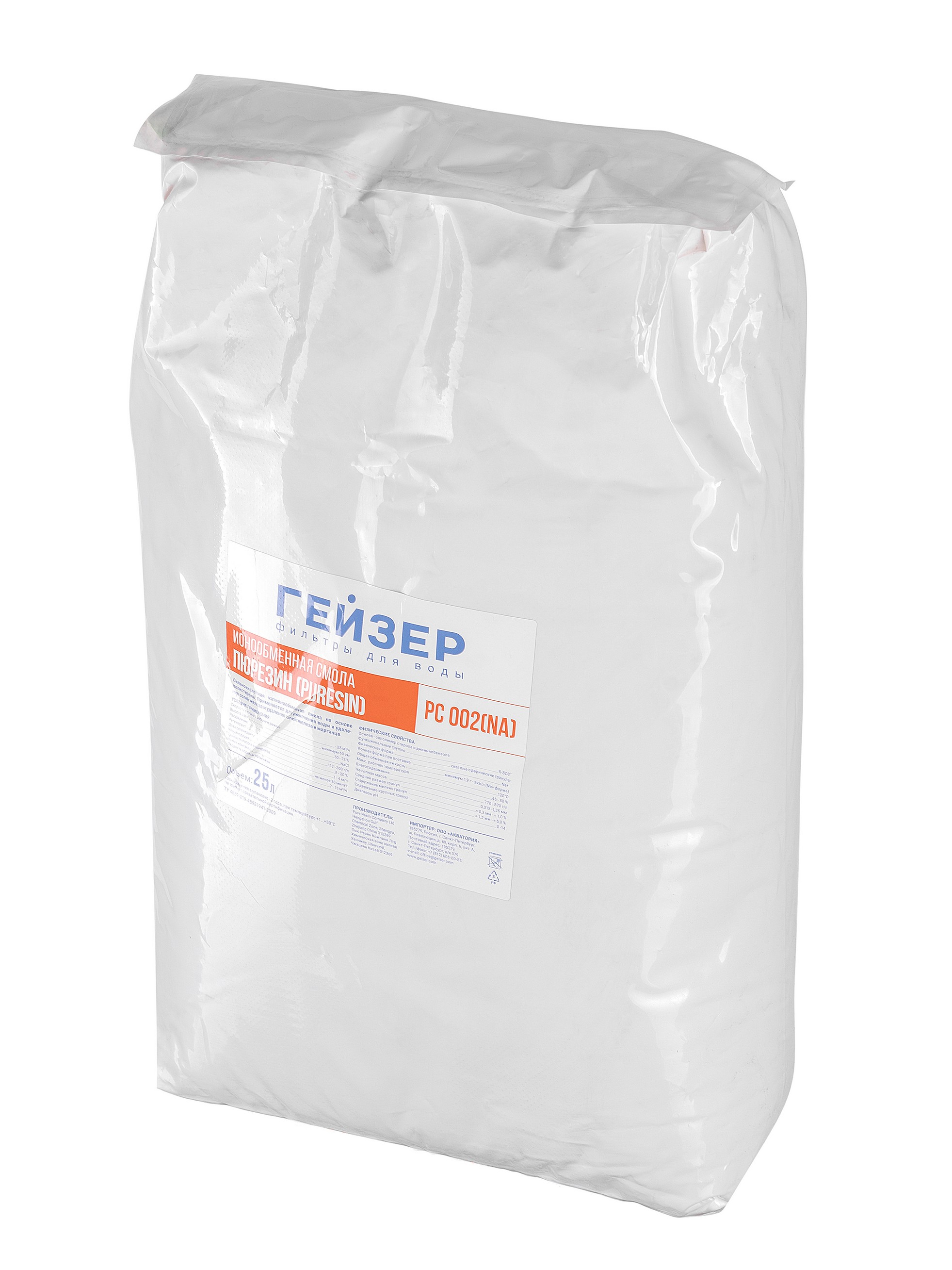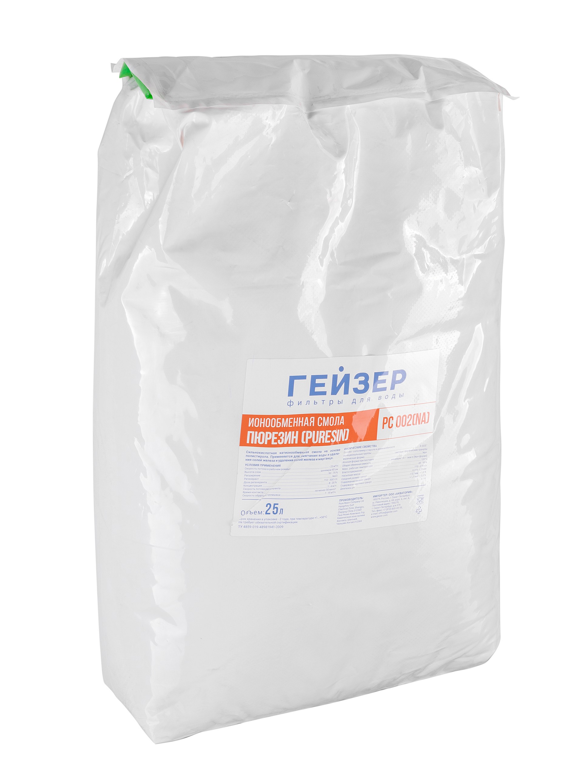 Сильнокислотная катионообменная смола для умягчения воды на основе полистирола. Удаляет из воды ионы кальция и магния, заменяя их ионами натрия. После истощения емкости должна быть подвергнута регенерации раствором поваренной соли. Наряду с солями жесткости с помощью смолы могут удаляться соли железа и марганца.