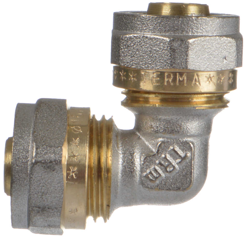 Уголок латунный никелированный 16х16 цанга/цанга ТeRma 01200 предназначен для создания разъемных соединений в системах металлопластиковых трубопроводов. Температура рабочей среды до +95°C, нормативное давление 25 бар.
