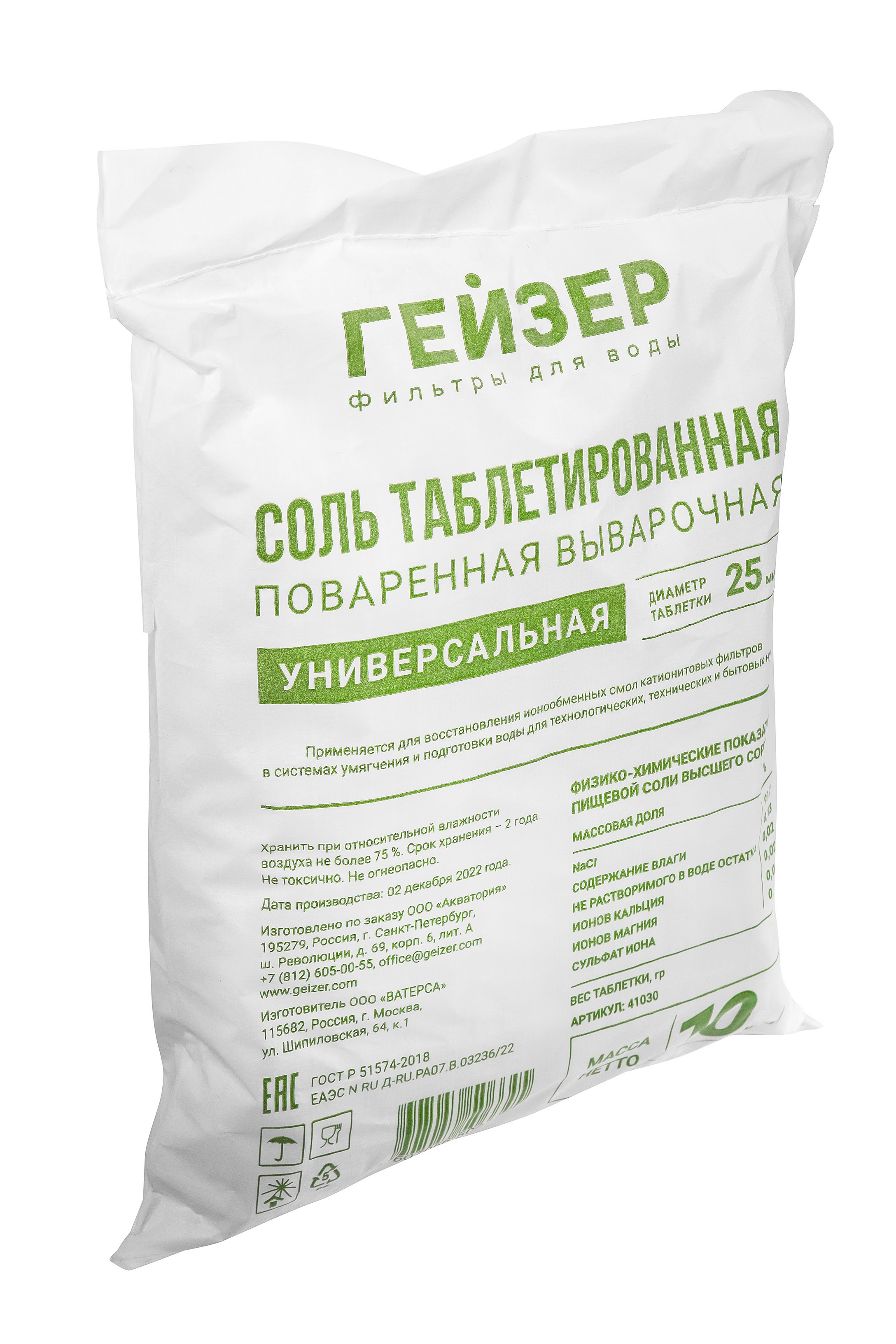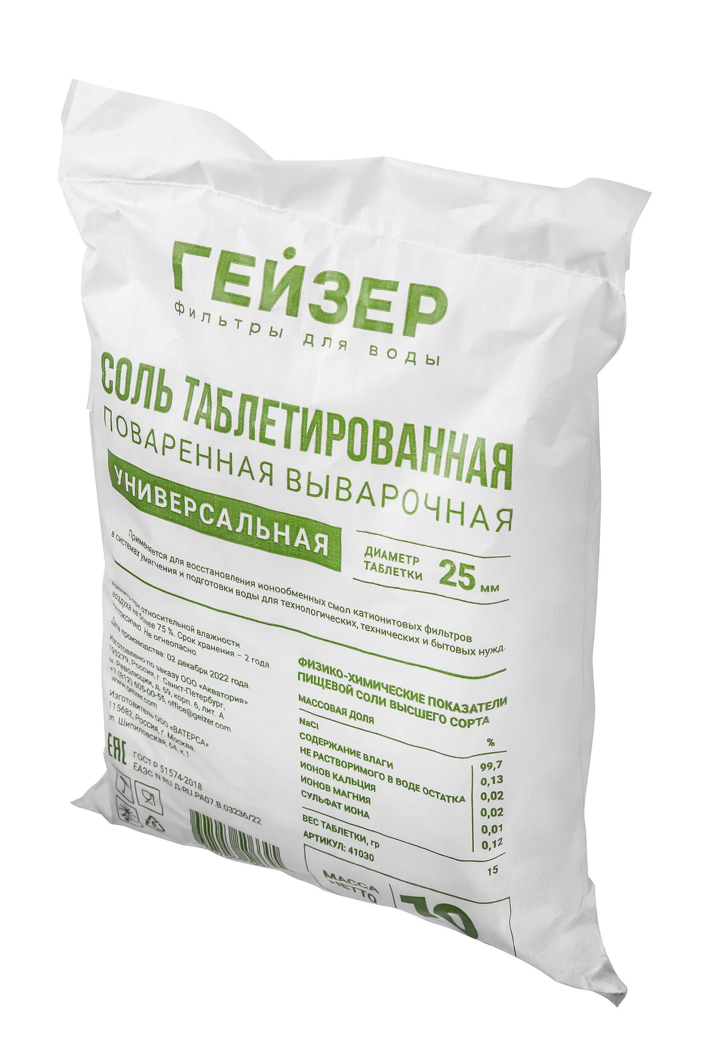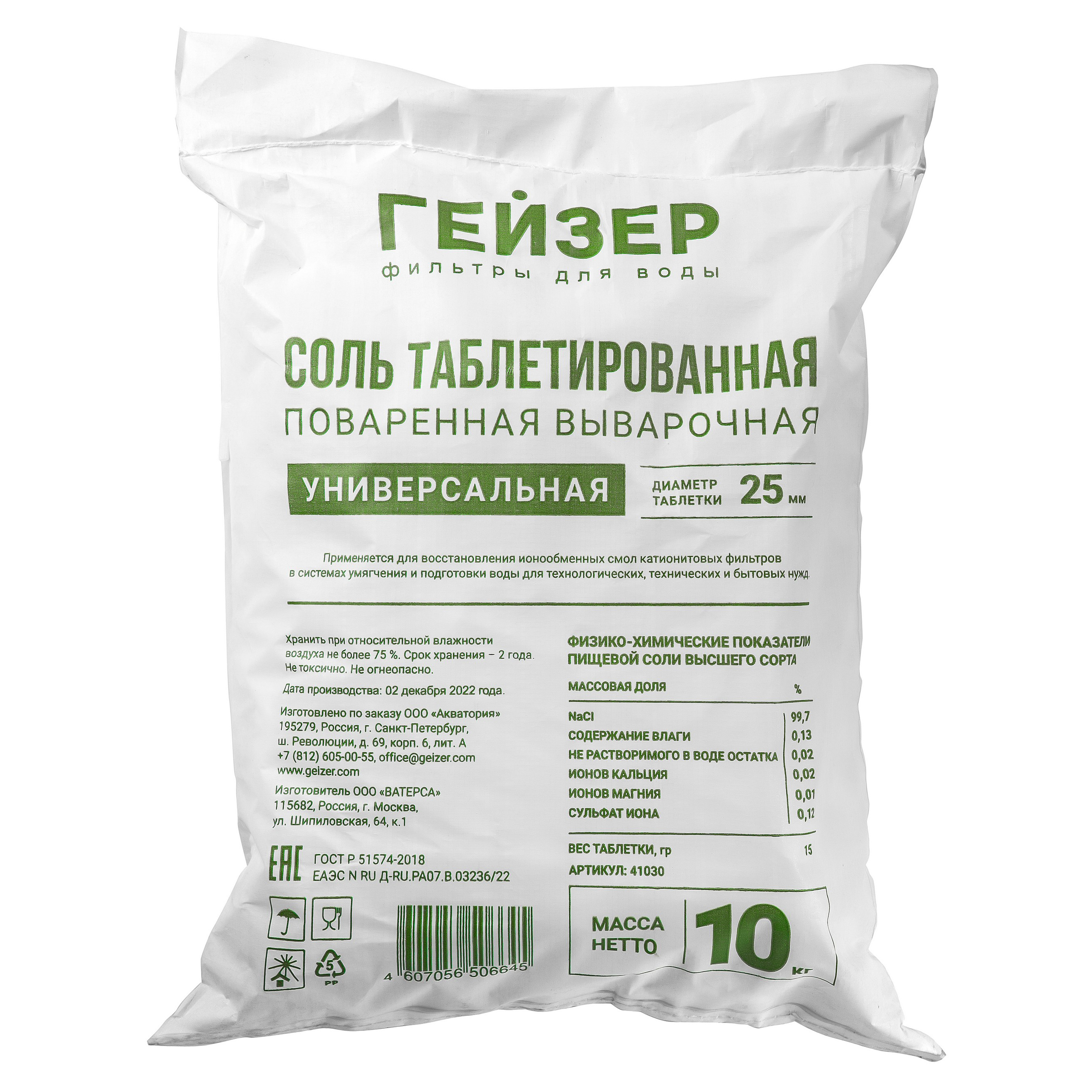Соль таблетированная Гейзер 10 кг (арт. 41030) применяется для восстановления свойств ионообменных смол в системах умягчения воды. Используется в водоумягчительных установках, применяемых в процессах водоподготовки для пищевых, фармацевтических и прочих производств, в промышленных и коттеджных системах отопления и горячего водоснабжения.