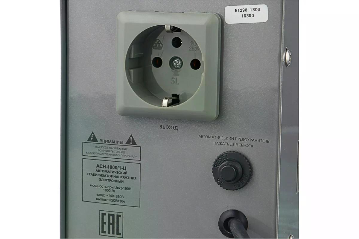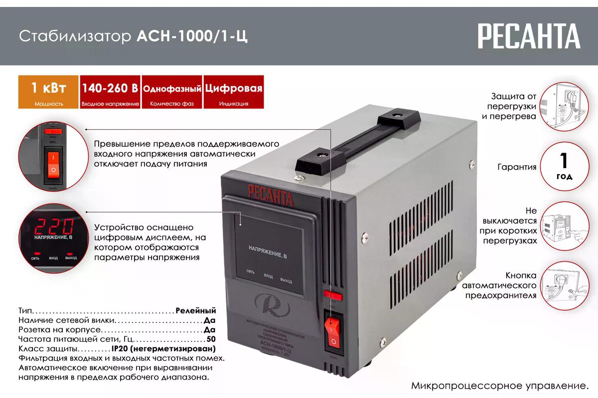 Стабилизатор напряжения Ресанта АСН 1000/1-Ц релейного типа разработан для защиты маломощных бытовых приборов от скачков напряжения в сети. Прибор обеспечивает стабильное электропитание с точностью до ±8% от номинального значения 220В.