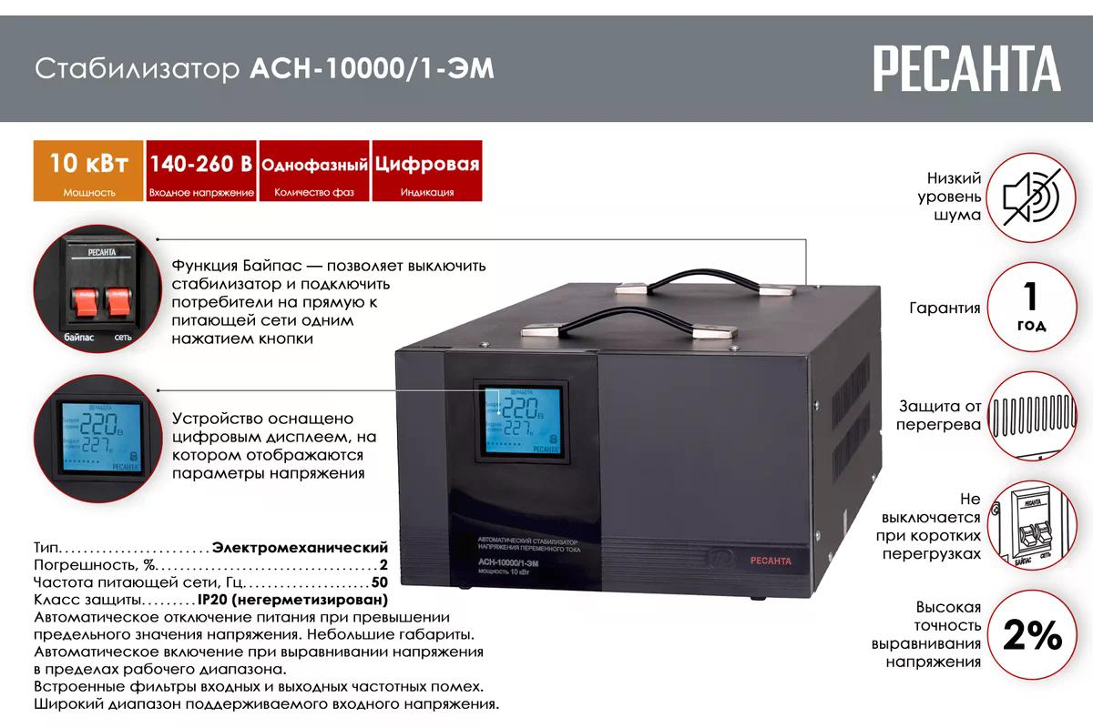 Стабилизатор напряжения Ресанта АСН-10000/1-ЭМ (63/1/8)