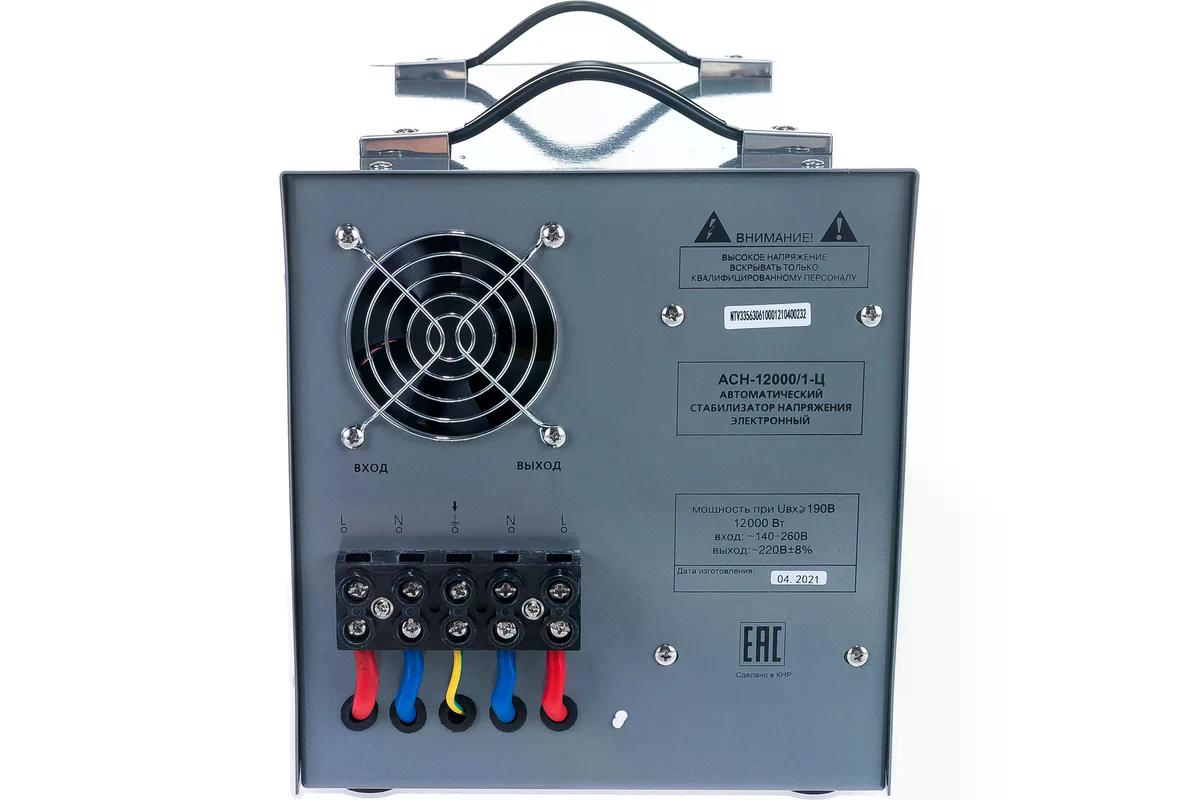 Мощная конструкция стабилизатора дополнена эффективной системой принудительного охлаждения, что обеспечивает стабильную работу даже при максимальных нагрузках. Устройство имеет класс защиты IP20 и предусматривает удобное напольное размещение. Благодаря высокой производительности стабилизатор способен обеспечить стабильным питанием как частный дом, так и небольшой промышленный объект, надёжно защищая всё подключённое оборудование от негативных последствий перепадов напряжения.