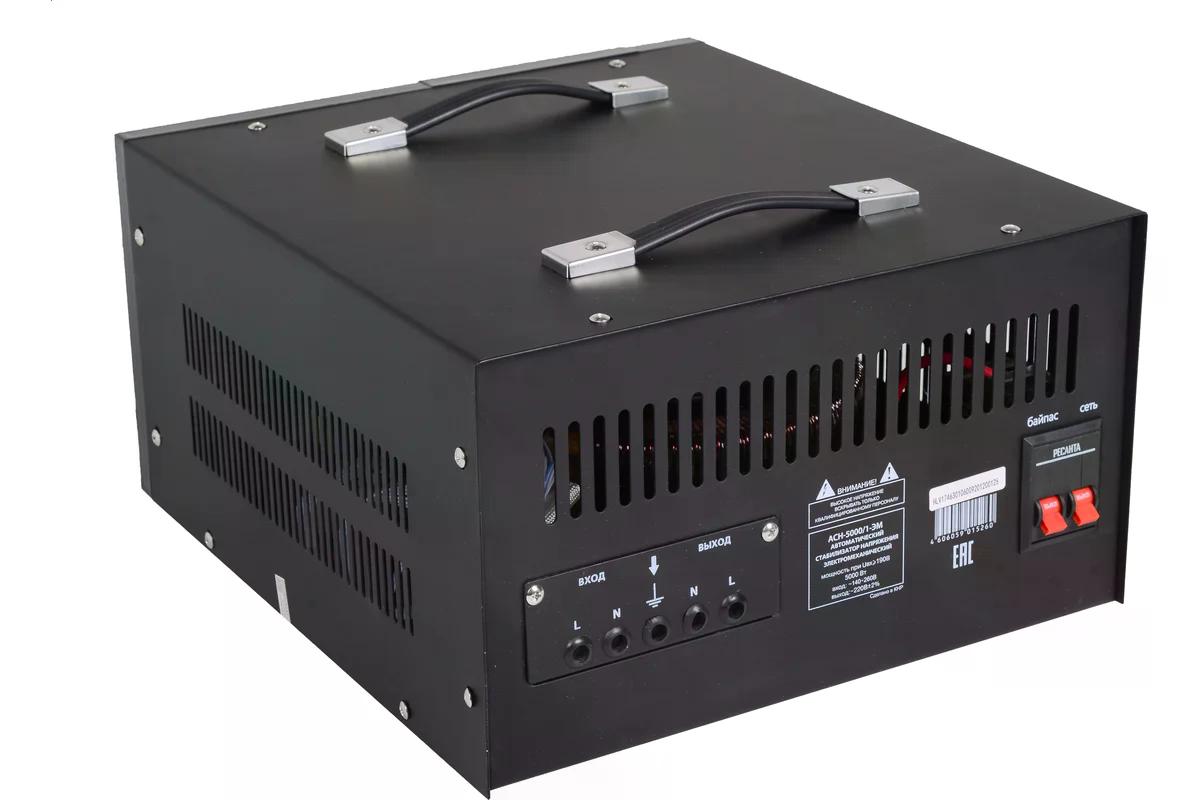 Стабилизатор напряжения Ресанта АСН-5000/1-ЭМ электромеханического типа предназначен для точной стабилизации и защиты подключенных электроприборов от скачков напряжения. Стабилизатор способен выравнивать входное напряжение в диапазоне от 140 до 260 В и поддерживать стабильное выходное напряжение 220 В с минимальной погрешностью ±2%, что обеспечивает качественную и безопасную работу подключённых устройств суммарной мощностью до 5 кВт.