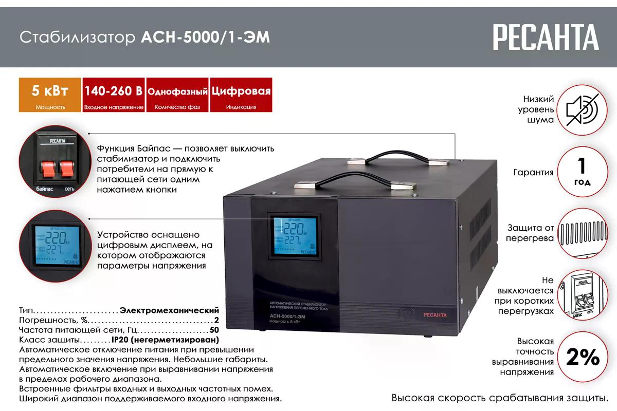 Стабилизатор напряжения Ресанта АСН-5000/1-ЭМ (63/1/6)