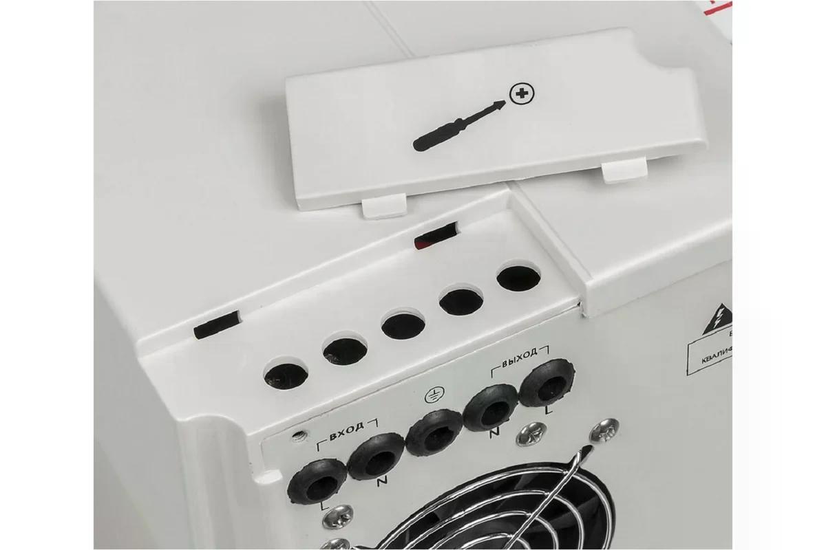 Прочный металлический корпус имеет класс защиты IP20, что гарантирует безопасную эксплуатацию в стандартных условиях. Благодаря настенному креплению стабилизатор можно компактно разместить в любом удобном месте. Охлаждение осуществляется за счет принудительной вентиляции, что позволяет устройству эффективно работать даже при высоких нагрузках. КПД стабилизатора достигает 97%, что минимизирует потери энергии. LCD-дисплей отображает все ключевые параметры работы: входное и выходное напряжение, уровень нагрузки, состояние защитных систем и обратный отсчет времени задержки включения.