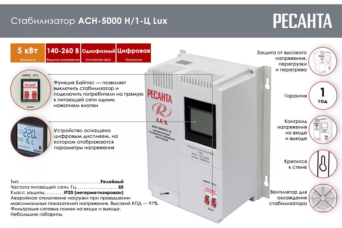 Стабилизатор напряжения Ресанта АСН-5000Н/1-Ц серии LUX релейного типа предназначен для защиты бытовой техники от скачков напряжения в однофазных сетях 220 В. Он эффективно стабилизирует напряжение на входе в диапазоне от 140 до 260 В до целевого показателя 220 В с точностью ±8%. Данная модель поддерживает подключение суммарной мощности до 5 кВт (при 190 В) и выдерживает ток нагрузки до 26,3 А, поэтому она подходит для комплексной защиты мощной бытовой и офисной техники.