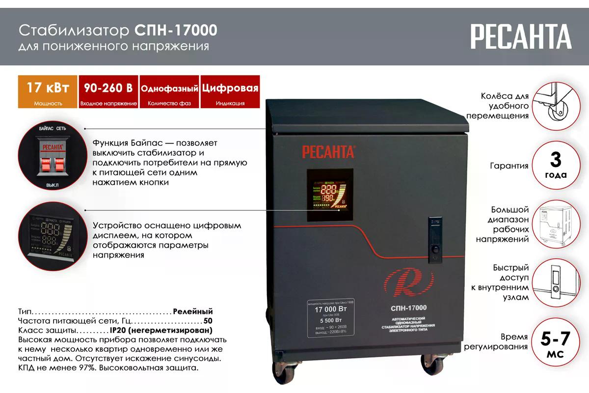Стабилизатор напряжения Ресанта СПН-17000 — это релейное устройство, предназначенное для стабилизации напряжения и защиты электроприборов от скачков напряжения. Его основное назначение — нормализация входного напряжения в диапазоне от 90 до 260 В и обеспечение стабильного выходного напряжения на уровне 220 В с допустимым отклонением ±8%. Максимальная суммарная мощность подключаемых приборов составляет 17 кВт, что позволяет применять его для обеспечения энергией крупногабаритных и энергоёмких установок.