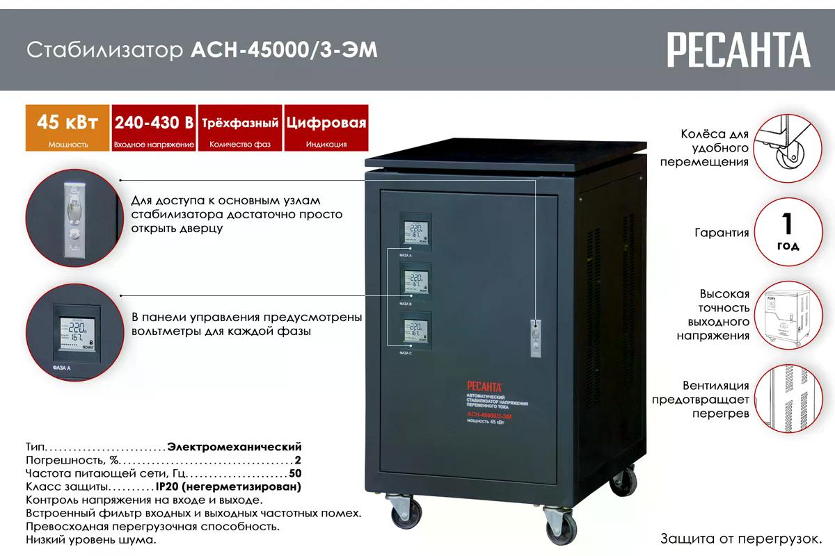 Стабилизатор идеально подходит для обеспечения стабильным питанием частных домов, производственных и офисных зданий. Благодаря высокой мощности и исключительной точности регулирования, Ресанта АСН-45000/3-ЭМ гарантирует бесперебойную работу даже самого требовательного оборудования.